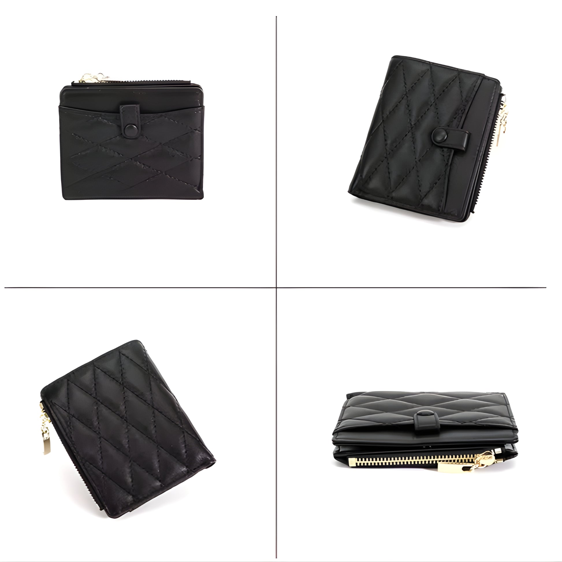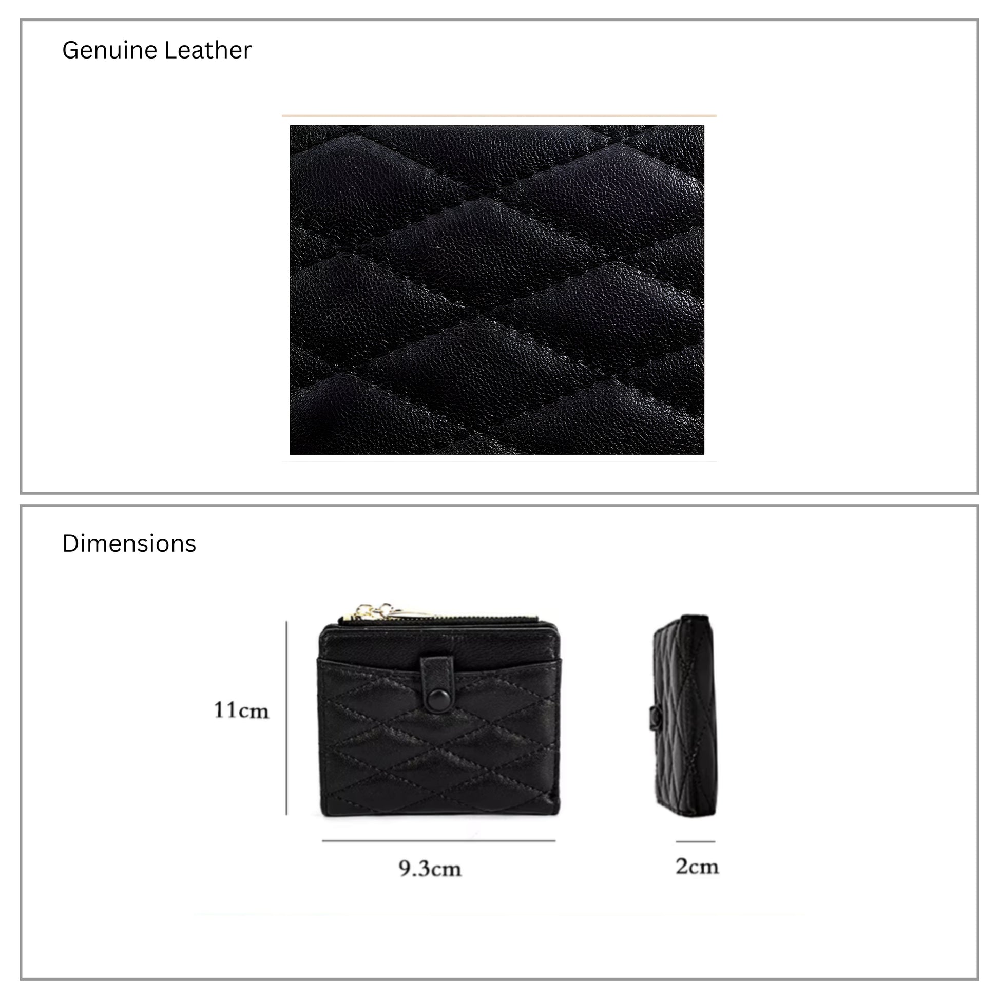 Women's Compact Genuine Leather Wallet – Luxury Quilted Design with 7 Card Slots, Side Zipper Pocket & Secure Snap Closure